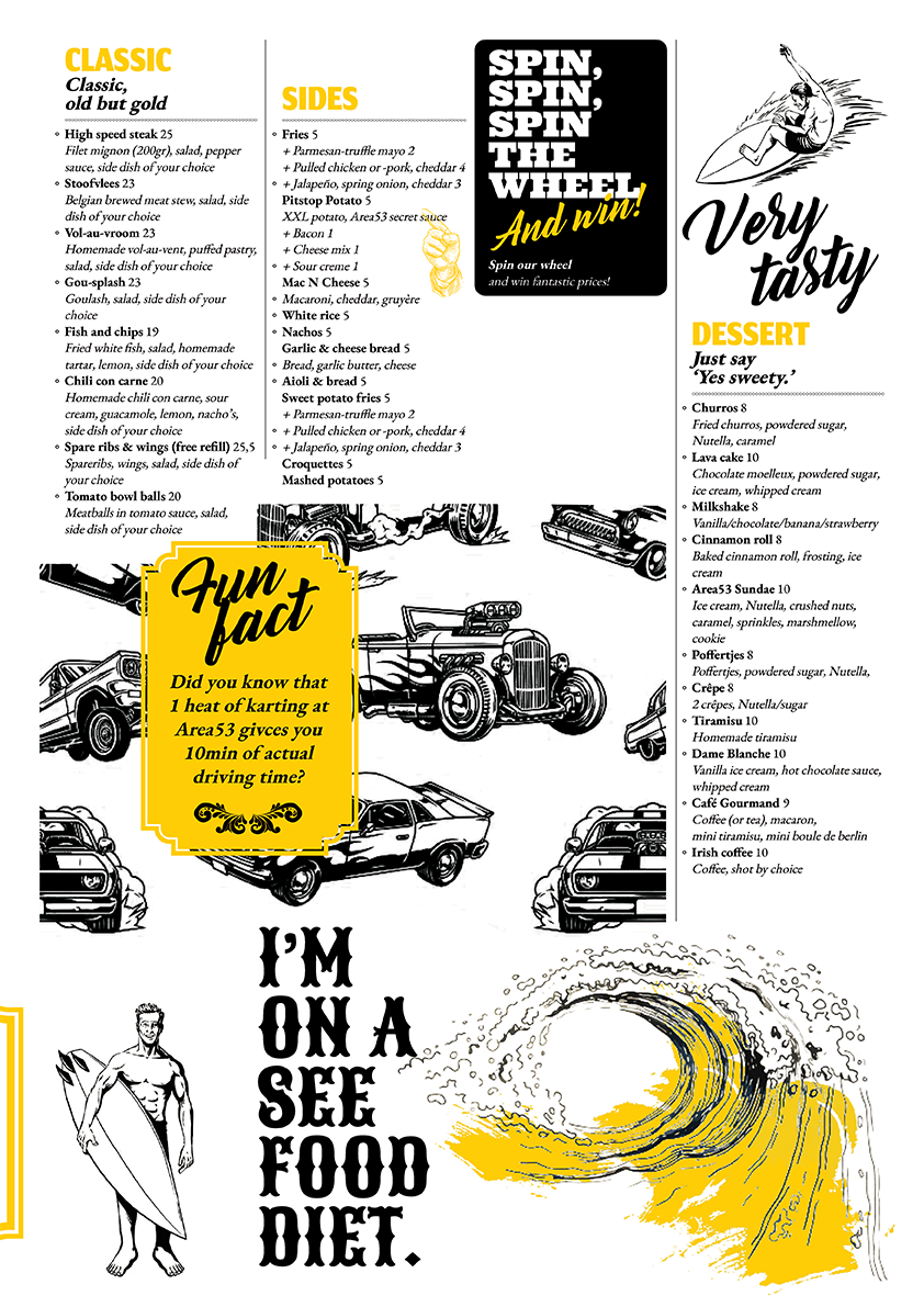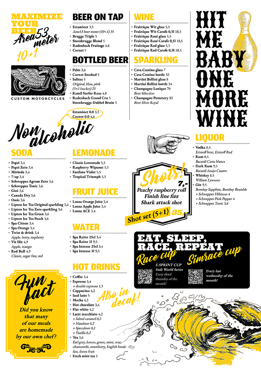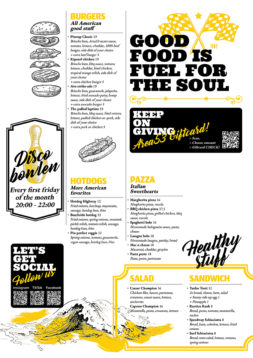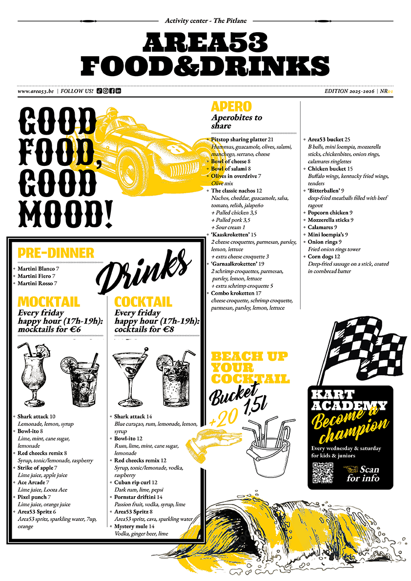 In The Pitlane van Area 53 kun je genieten van een breed aanbod aan streetfood en snacks. Op het menu staan favorieten zoals hamburgers, hotdogs en nacho's, maar ook frisse salades en Belgische klassiekers.